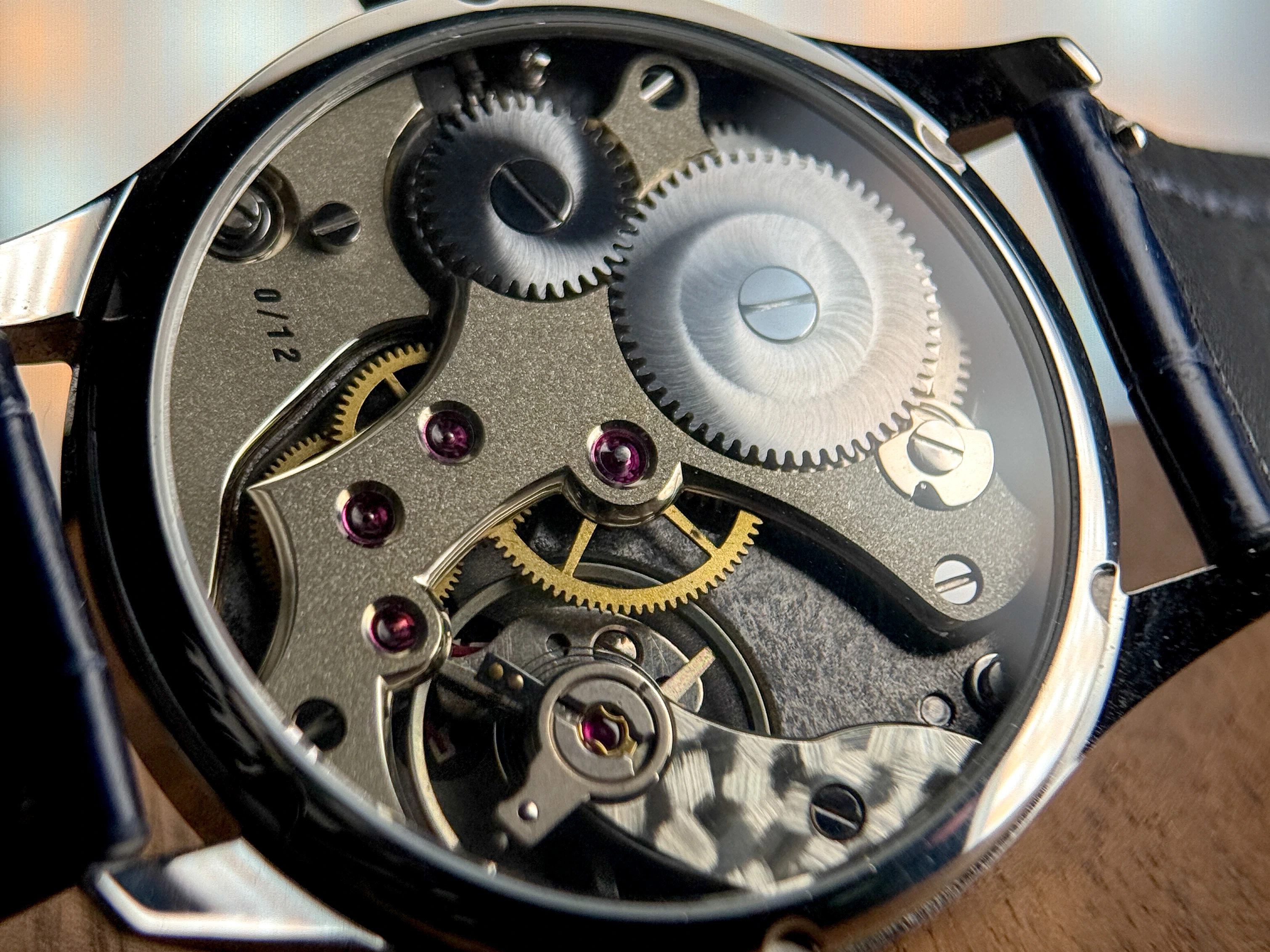 Each is decorated with a fine snailing pattern, applied on the lathe with careful control. The crown wheel features a single, tight spiral that reflects light with a dynamic, radial effect.